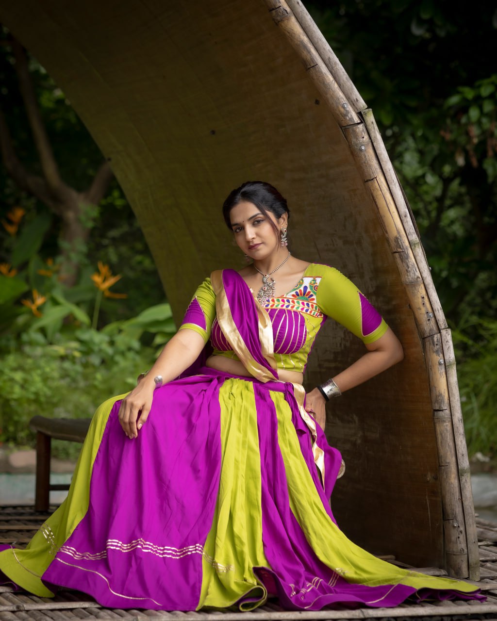 Lehenga Work: Purple and Parrot Color Kali With Gota patti and Traditional Border