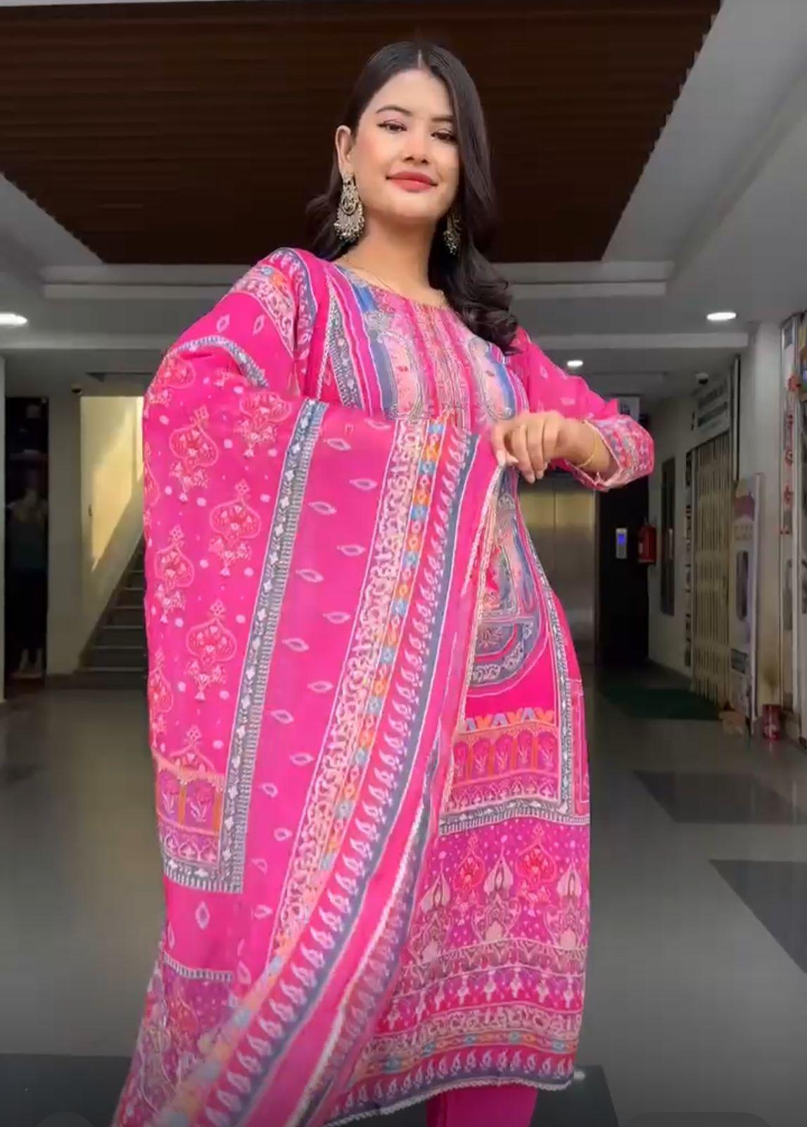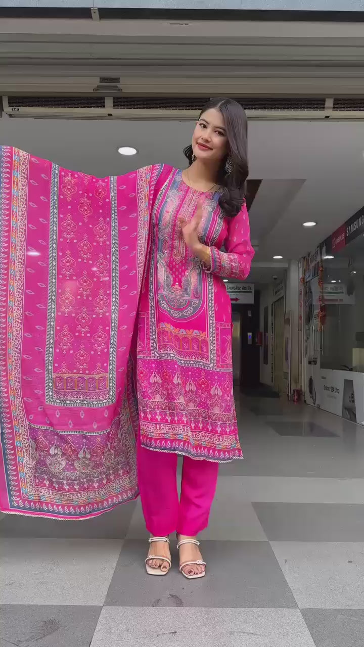 *The Chinon fabric used in both the kurti and dupatta provides a beautiful base for the elaborate and colourful printed designs, creating a visually rich and elegant ethnic ensemble. The designs are most likely digitally printed onto the Chinon fabric. Lightweight and Flowy Drape Soft and Smooth Texture The vibrant and rich hot pink color is well-saturated, indicating that the Chinon fabric has taken the dye effectively.